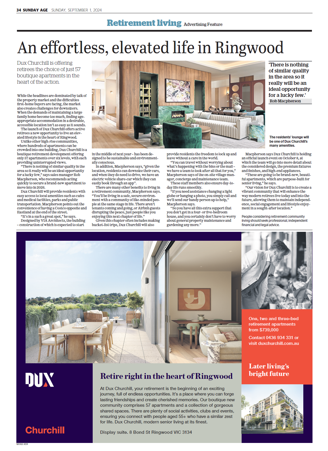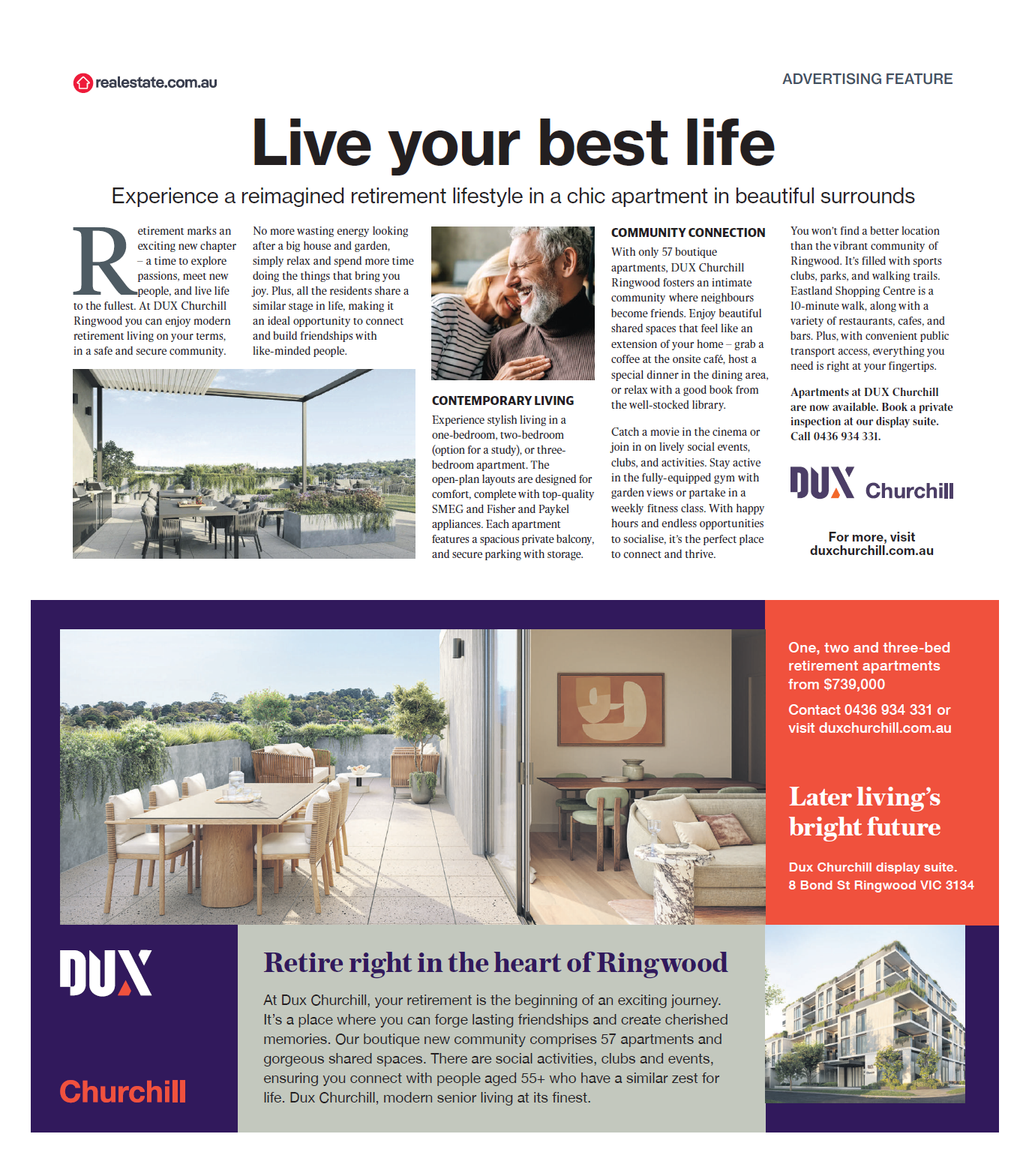 Dux Churchill, Orion's inaugural retirement living development, was featured in the Sunday Age and the Herald Sun. The articles explore how Dux Churchill is poised to become a premier destination for senior retirees.